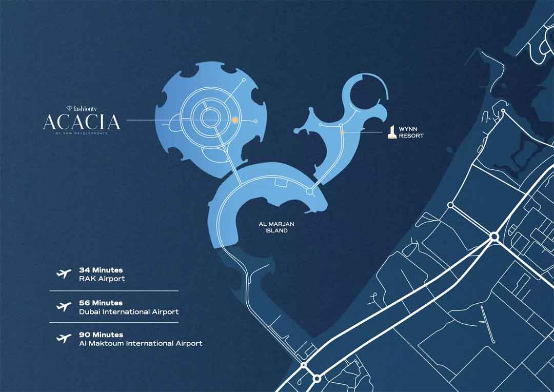 Fashion TV Acacia is strategically located on Al Marjan Island, Ras Al Khaimah’s most prestigious coastal destination. This prime location ensures residents enjoy peaceful beachfront living while remaining connected to key transport links, urban hubs, and leisure destinations. Fashion TV Branded Residences on Al Marjan Island Ras Al Khaimah.